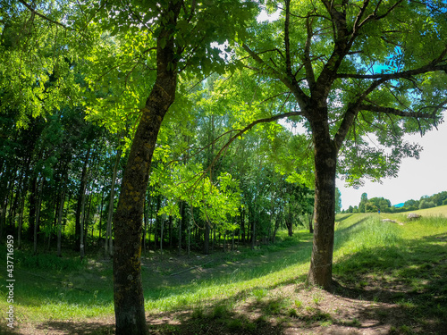 © helfei, Fototapeta premium Super wide angle shots with action cam of forest and meadow in spring in daylight