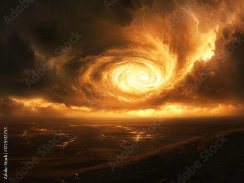 © Bijac, Naklejka premium supercell storm formation over plains, dramatic spiral clouds, lightning strikes, ominous atmosphere, golden hour lighting