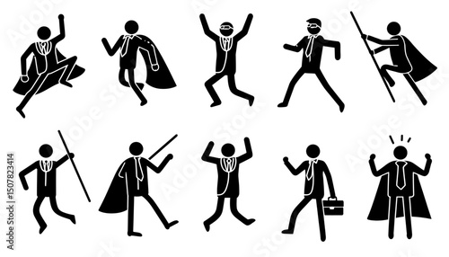 © imran, Obraz premium Superhero Businessman Icon Set � Flying Stick Figure Pictograms of Victory Worker, Employer and Corporate Hero Vector Illustrations