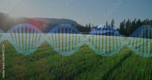 Fototapeta premium Superimposing translucent blue DNA double helix across sunlit meadow, with...
