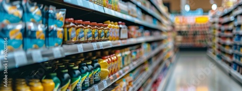 © Juan, Fototapeta premium Supermarket aisle with various food products displayed on shelves