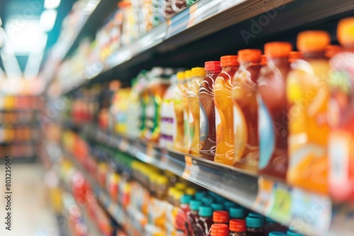Fototapeta premium Supermarket Aisles with Colorful Products in Soft Focus Background
