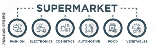 © Icon Designer, Fototapeta premium Supermarket Banner Web Concept with fashion, electronics, cosmetic, automotive, food and vegetable icons