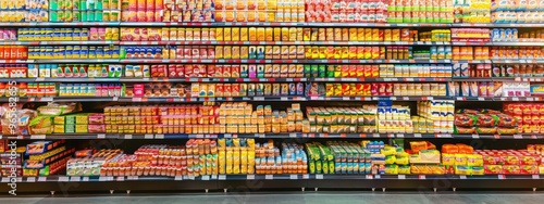 Naklejka premium Supermarket shelves packed with a variety of dairy and snack products