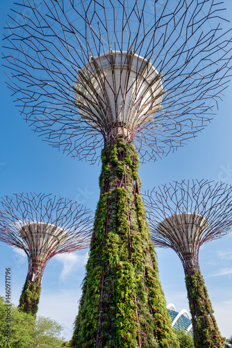 © 18042011, Fototapeta premium Supertree Grove at Gardens by the Bay in Singapore, showcasing towering vertical gardens with lush greenery against a bright blue sky. Iconic architectural and ecological landmark.