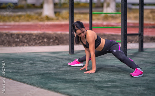 © kolotype, Fototapeta premium Supple young woman preparing to do the splits