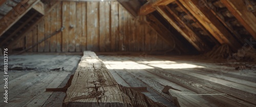 © AkuAku, Obraz premium Support construction in attic featuring a weak wooden floor beam