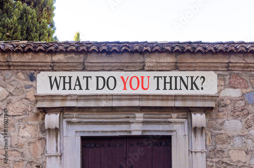 Fototapeta premium Support, help what do you think symbol. Concept words What do you think on beautiful white marble sign plate. Beautiful stone wall background. Business what do you think concept. Copy space.