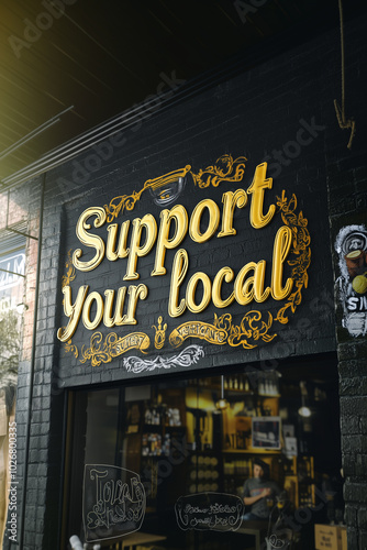 Naklejka premium "Support Your Local," black background with gold text, poster art