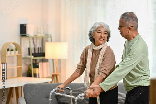 © Prathankarnpap, Obraz premium Supportive senior husband helping his wife walking with walker for rehabilitation and therapy