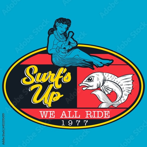 © delacroix7, Obraz premium surf style print with hawaiian woman and text blue background