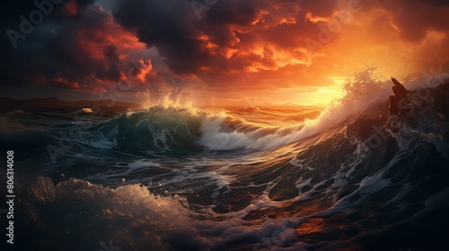 © Bilal, Fototapeta premium Surf wave in the ocean at sunset.