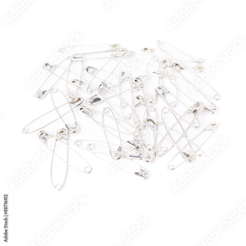 Fototapeta premium Surface covered with multiple safety pins isolated on white