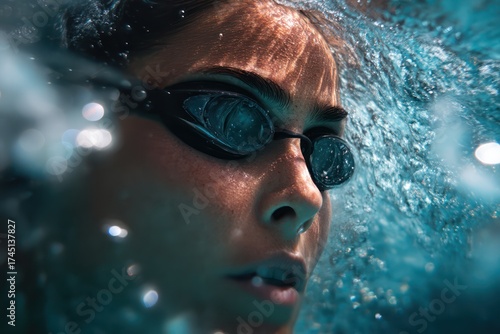 © Igor, Fototapeta premium Surface-Level Portrait of Woman Swimming with Goggles