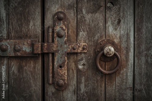 © vxnaghiyev, Fototapeta premium Surface of an old wooden door with corroded metal parts. Locked gateway. Concepts of solitude, obstacles, protection, and mystery.