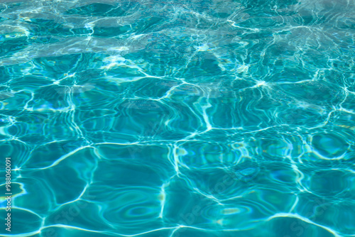 © Korneliia, Fototapeta premium Surface of pool water. Blue sea water background texture. Water with ripples. Water waves pattern texture background. Abstract banner background.