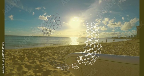 Naklejka premium Surfboard lying on golden sand at beach near beachgoers, with hexagonal overlays hovering