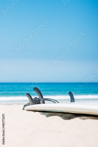Obraz premium Surfboard with fins on sand at beach