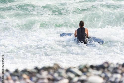 © studiolaska, Naklejka premium Surfer enjoying the waves on the beach near the district of Miraflores.