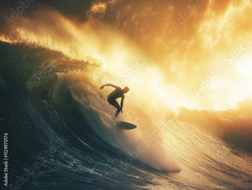 © Fotosmagoria, Naklejka premium Surfer na ogromnej fali, pryskająca woda i odbijające się światło słoneczne.
