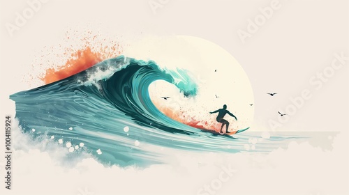 Fototapeta premium Surfer riding a giant wave with vibrant colors and ocean spray illustrative design