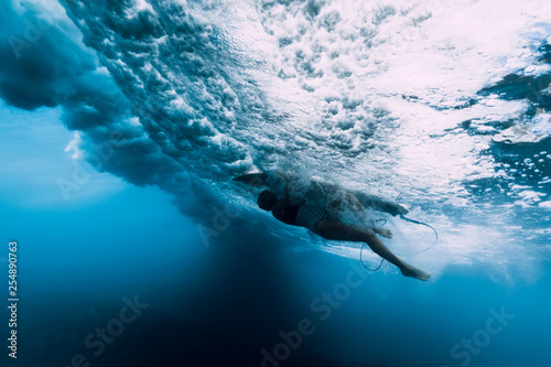 Fototapeta premium Surfer woman dive underwater. Surfgirl dive under big wave
