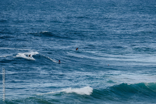 Fototapeta premium Surfers ride powerful blue waves in the ocean, capturing dynamic coastal...