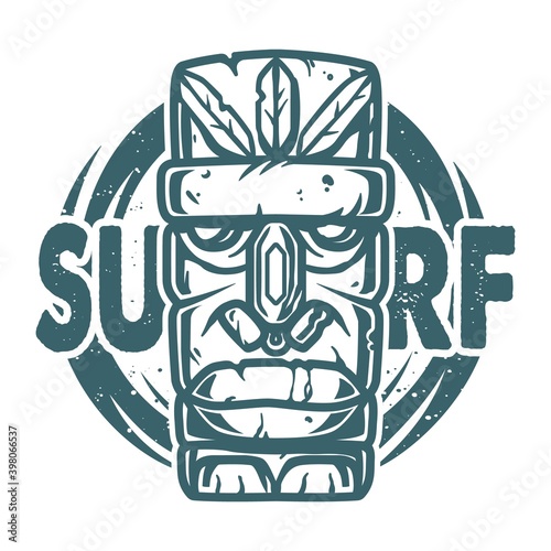 Naklejka premium Surfing print of stone tiki mask, face idol. Vector illustration hawaii summer t-shirt design