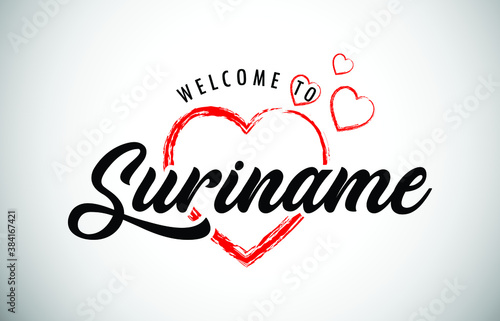 © Metreco, Naklejka premium Suriname Welcome To Message with Handwritten Font in Beautiful Red Hearts Vector Illustration.