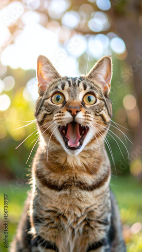 © Yolania, Obraz premium Surprised brown tabby cat staring with big eyes and open mouth outdoors in sunlight