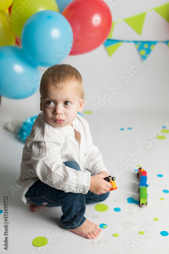 © Svetlana, Obraz premium surprised child on his birthday. birthday photo zone with flags and balloons