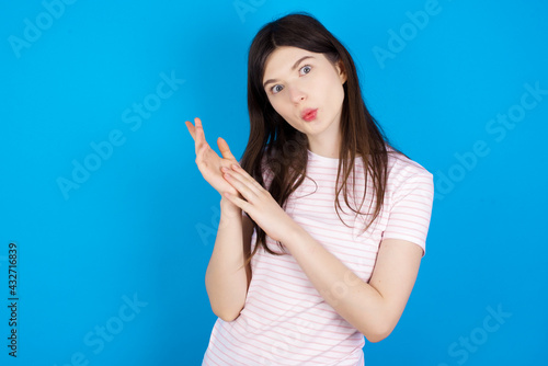 © Roquillo, Fototapeta premium Surprised emotional young beautiful Caucasian woman wearing stripped T-shirt over blue wall rubs palms and stares at camera with disbelief