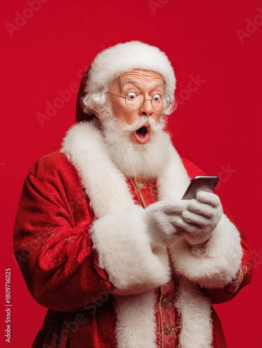 © Johannes, Naklejka premium surprised funny amazed old bearded santa claus wearing costume holding cell phone using mobile app on smartphone shocked by christmas promotion xmas applications ads isolated on red background no log