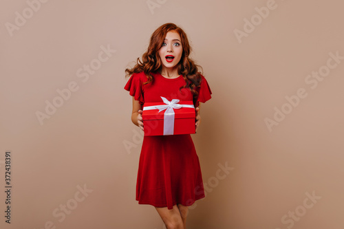 Fototapeta premium Surprised girl in short red dress holding gift. Adorable long-haired woman...