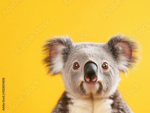 © Bijac, Fototapeta premium surprised koala with wide eyes peeking out from a vibrant yellow background, showcasing a humorous and adorable expression, perfect for animal lovers