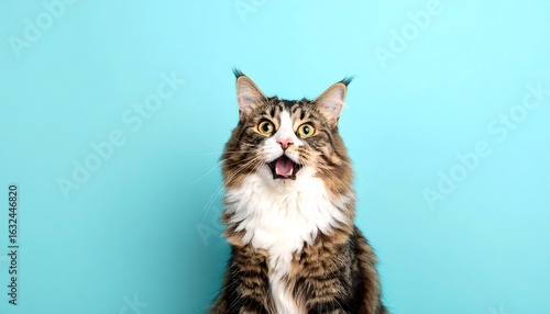 © Devano, Fototapeta premium Surprised Maine Coon Cat with Open Mouth on Light Blue Background