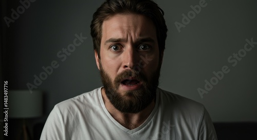Fototapeta premium Surprised man with beard in low light, expressing shock in a dimly lit room