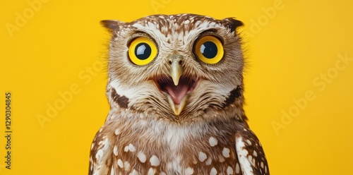 © xoan, Fototapeta premium Surprised owl, yellow background, wildlife, nature