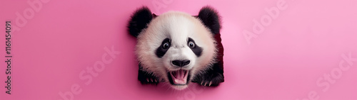 Naklejka premium Surprised panda face breaking through pink background with playful...