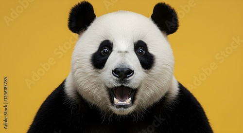 Fototapeta premium Surprised panda with wide eyes and mouth on vibrant yellow background