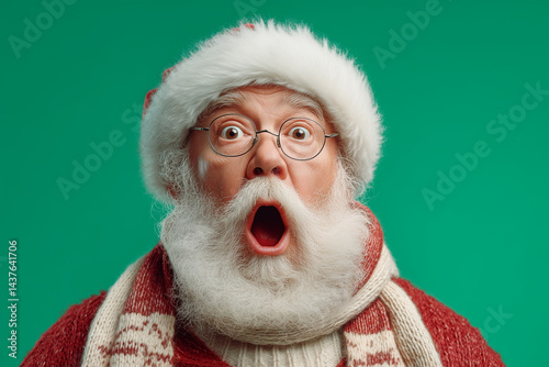 © neodeo_concept, Naklejka premium Surprised Santa Claus on Green Background Capturing Holiday and Christmas Spirit