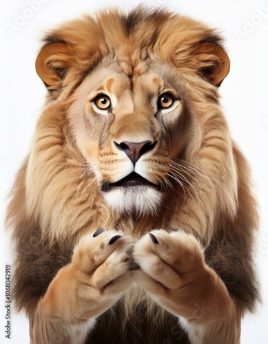 © pornpun, Fototapeta premium Surprised shocked lionshow hands for give up isolated on white background