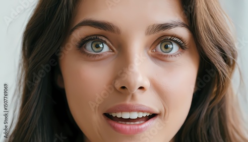 © vinona, Fototapeta premium Surprised woman expressing joy indoor setting portrait photography bright lighting close-up view emotion and expression