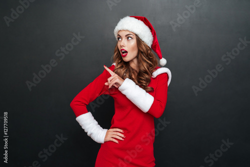 © Drobot Dean, Naklejka premium Surprised woman in christmas dress with finger point aside