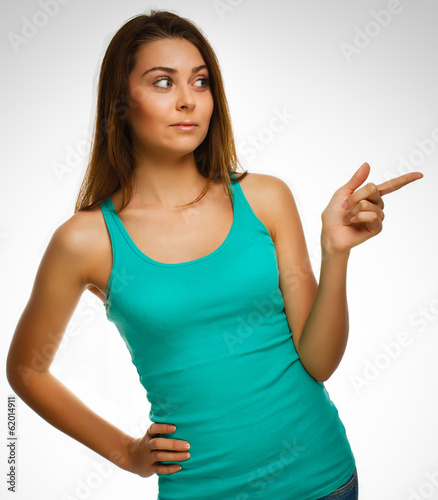 Fototapeta premium surprised woman shows finger in direction hand isolated on white