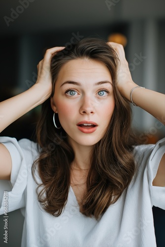 © Iryna, Fototapeta premium Surprised young caucasian female with long brown hair
