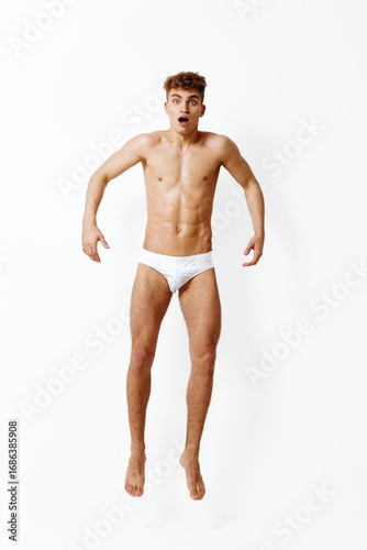 Fototapeta premium Surprised young man jumping with excitement, showcasing toned physique. White background emphasizing his expression and movement. Fitness and emotion concept.