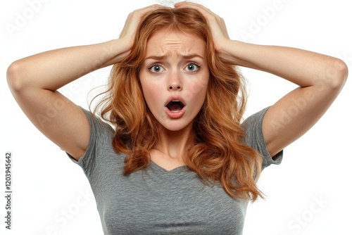 © Bojan, Fototapeta premium Surprised young woman holds her head in disbelief while expressing strong emotions in a bright setting