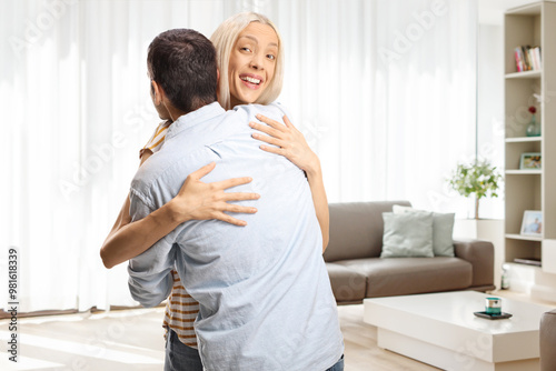 Fototapeta premium Surprised young woman in embrace with a man