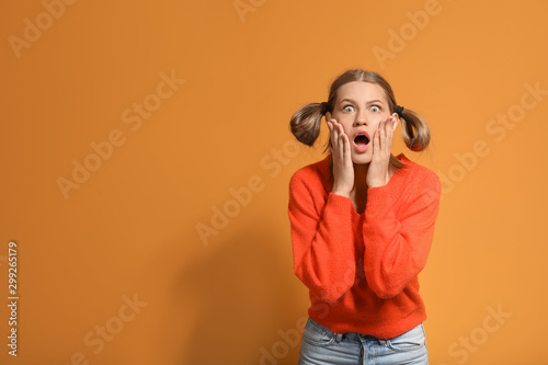 © Pixel-Shot, Obraz premium Surprised young woman on color background